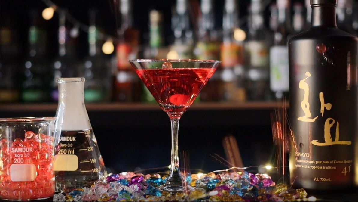 6. 칵테일 용액을 잔에 따른 후 체리를 넣습니다.